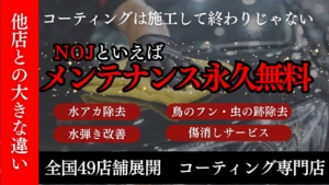 NOJでは、施工後の綺麗に仕上がったボディを維持するために必要不可欠なメンテナンスを永久無料で受ける事が出来ます。(洗車代¥2,000~3,500+税のみ頂戴します) 3か月1回がベストです。 回数制限等ございません。