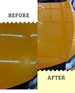 ボンネットの磨き前、磨き後の違いをご覧ください。